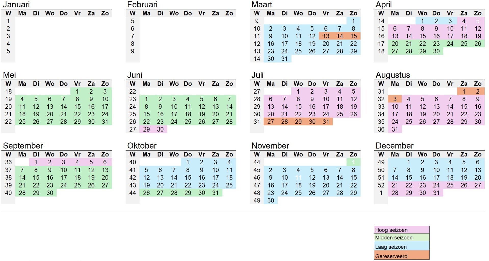 | Huurprijzen 2026 voor max. 6 personen | Laag | Midden | Hoog |